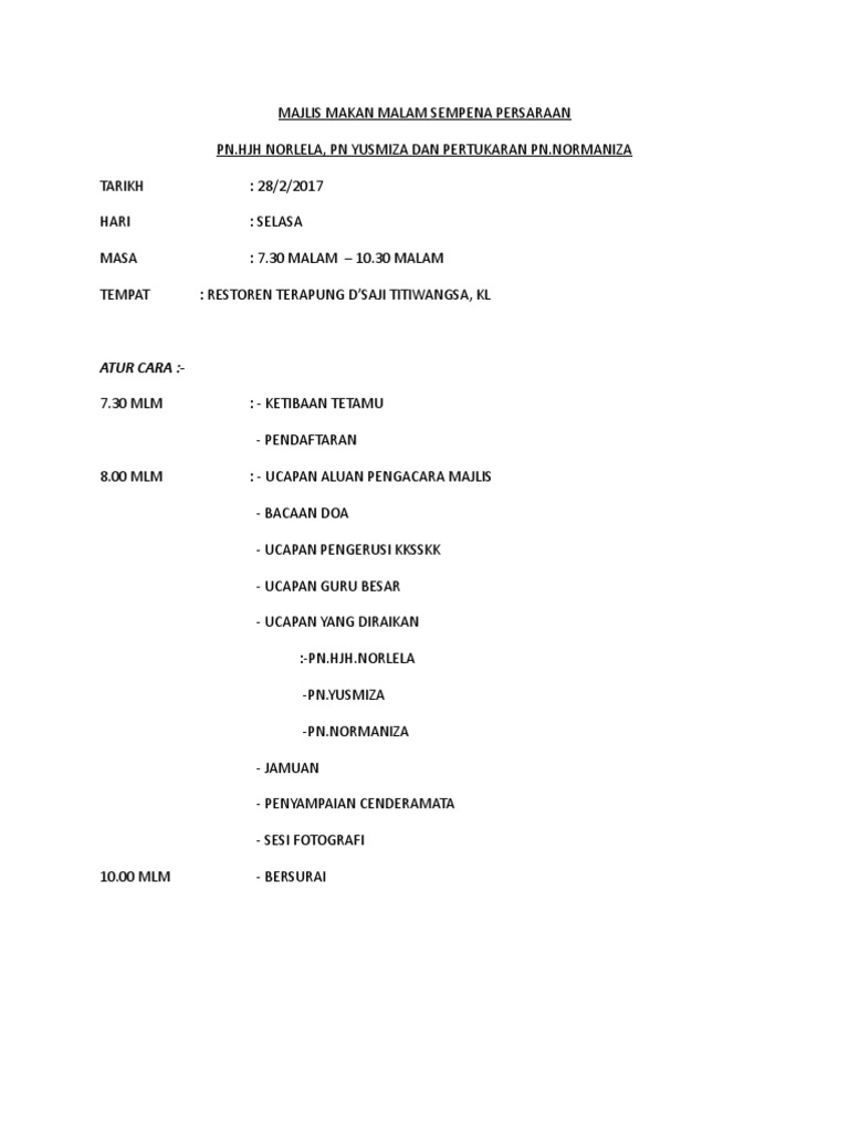 Aturcara Majlis Makan Malam Sempena Persaraan Pdf